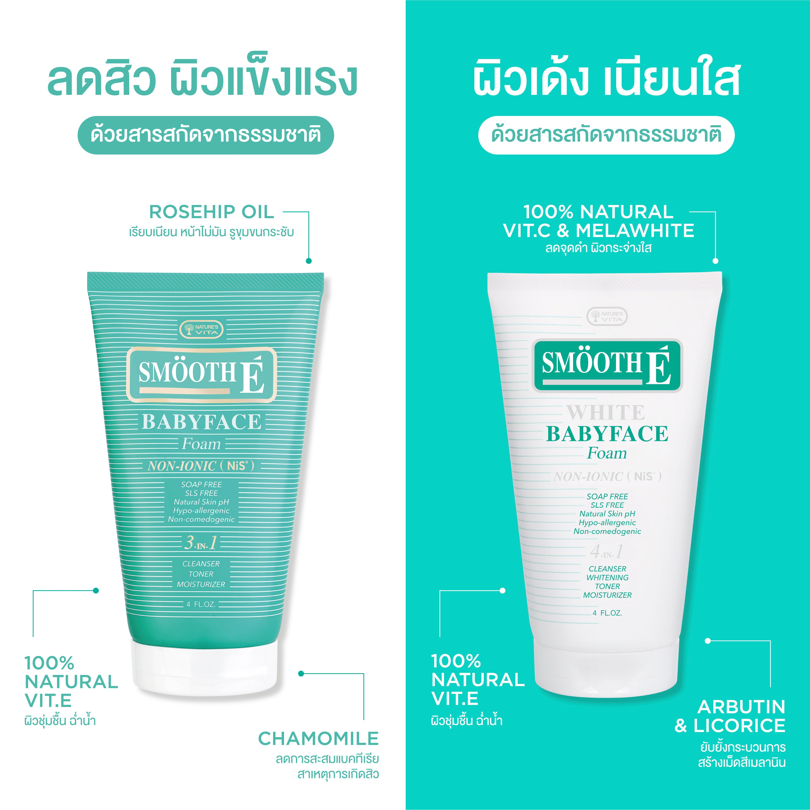 Smooth E Babyface Foam is a true non-foaming formula with 100% NiS (Non-Ionic) and no electrical charge, ensuring that it doesn't leave behind residues that can cause acne or wrinkles. It is enriched with Vitamin E and is suitable for all skin types, providing a soft and moisturized feel to the skin.