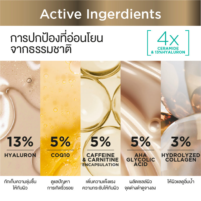 13% Hyaluron: ช่วยในการกักเก็บความชุ่มชื้นให้กับผิว ดังนั้นการเติม Sodium Hyaluronate ลงสู่ผิวนั้นเปรียบเสมือนการเติมความชุ่มชื้นให้แก่ผิว ทำให้ผิวแลดูอ่อนเยาว์ และแลดูสุขภาพดี