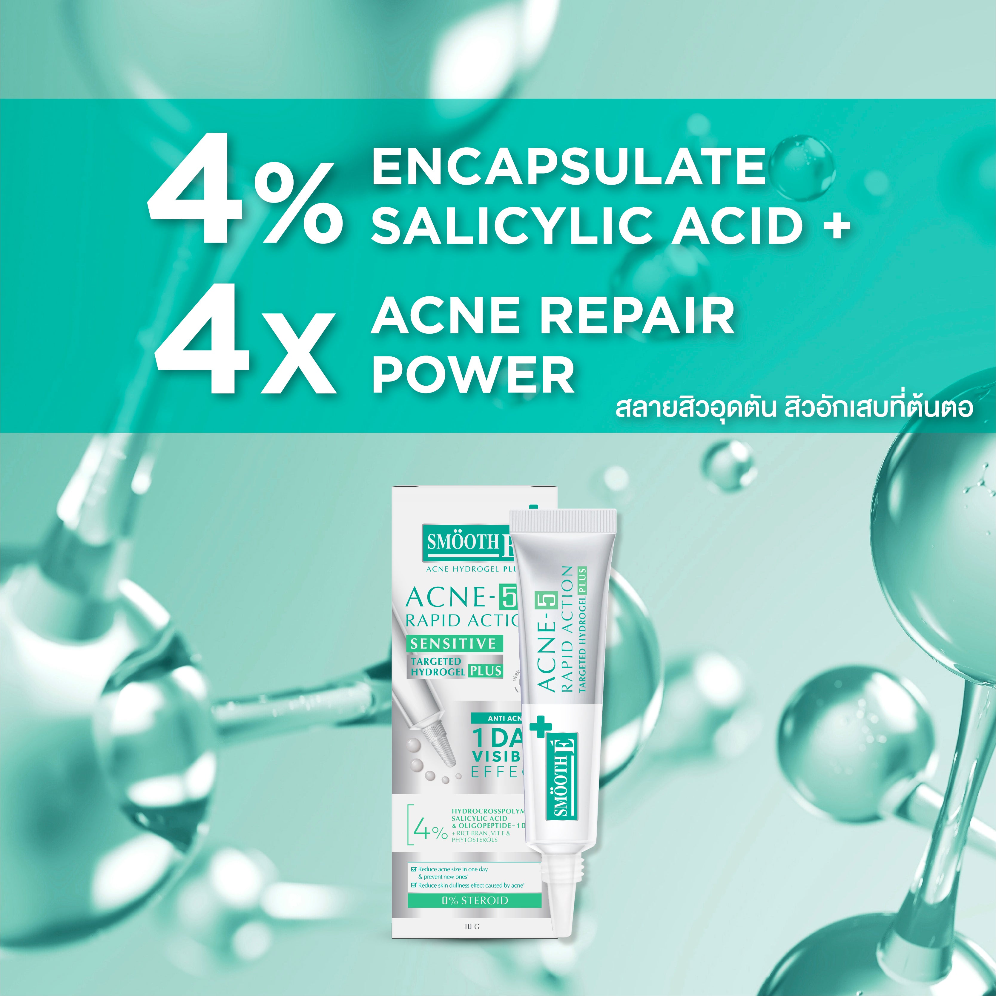ขจัดเซลล์ผิวสิ่งสกปรกความมันอุดตันรูขุมขนด้วยสารสกัด 4% Hydrogel Encapsulated Salicylic Acid ซึ่งออกฤทธิ์ลดการอักเสบสิวต่อเนื่องได้นาน 24 ชั่วโมง
