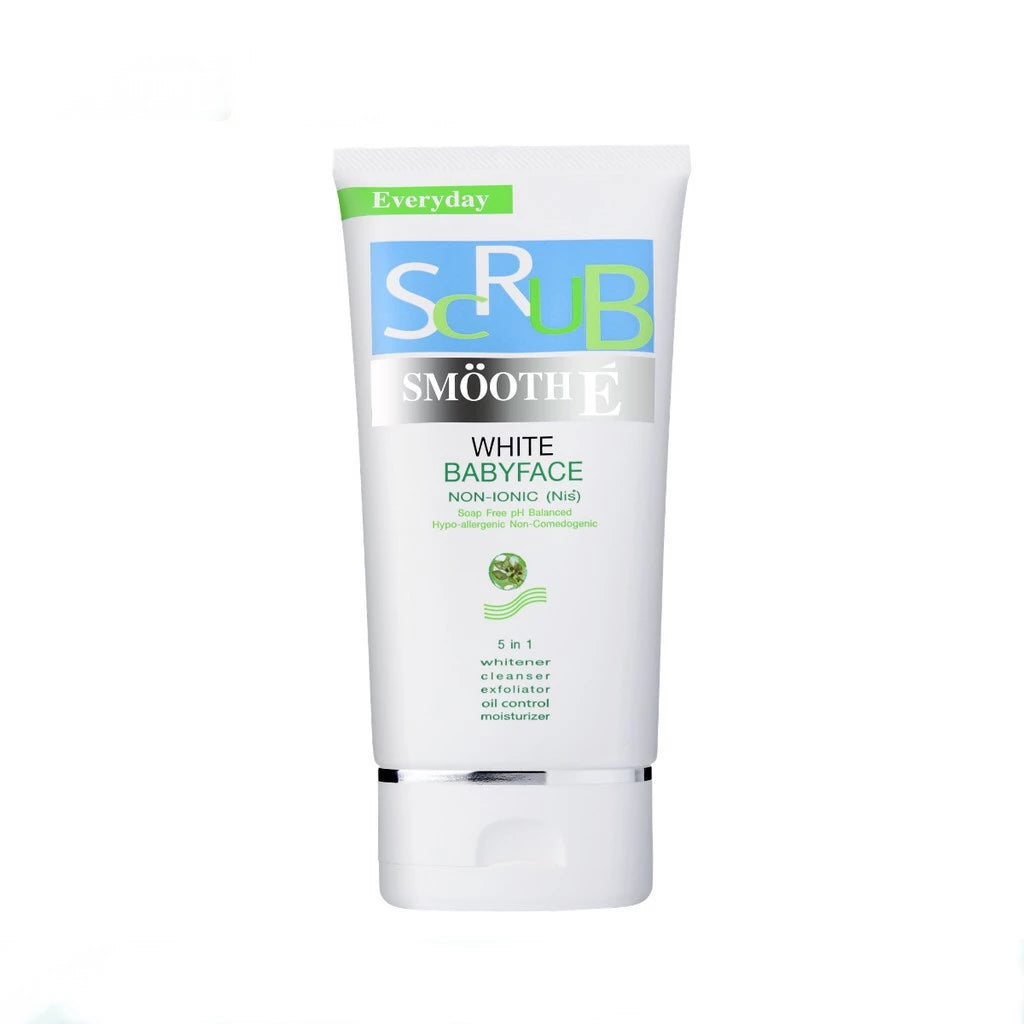 สมูท อี ไวท์ เบบี้เฟส สครับ ผลิตภัณฑ์ทำความสะอาดผิวสครับไม่มีฟอง Non-Ionic Surfactant (NIS) ไม่ทิ้งสารตกค้าง สครับช่วยผลัดเซลล์ผิวเก่าหมองคล้ำ สิวเสี้ยนให้หลุดออกอย่างอ่อนโยน พร้อมสารบำรุงผิว และสารช่วยเรื่องความขาว 3 ชนิด ช่วยให้ผิวกระจ่างใส และช่วยดูแลปัญหาแผลเป็นจากสารสกัดจากหอมใหญ่